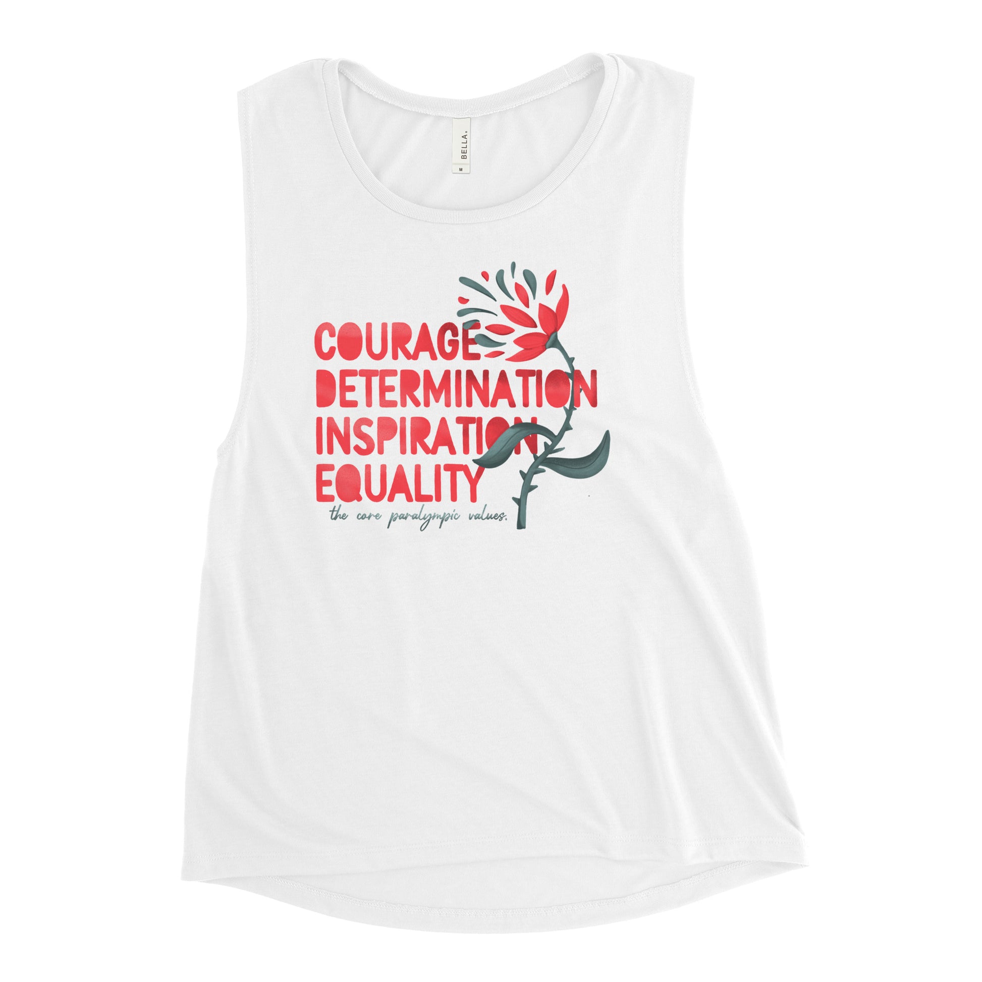 Emblazoned on the front, the Paralympic values—Determination, Inspiration, Courage, and Equality—serve as a powerful reminder of the strength and spirit inherent in the Paralympic community. Wear this tank with pride, knowing you’re promoting a message of empowerment and resilience.